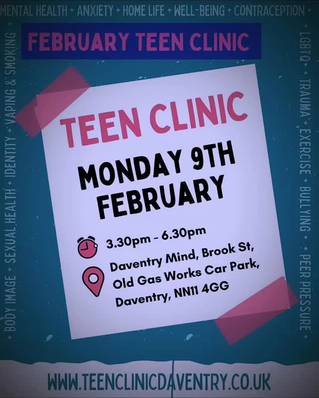 Teen Clinic Daventry runs once a month at Daventry Mind. There’s no need to book an appointment, just drop in, fill out a few details, and speak to our friendly team of health professionals.